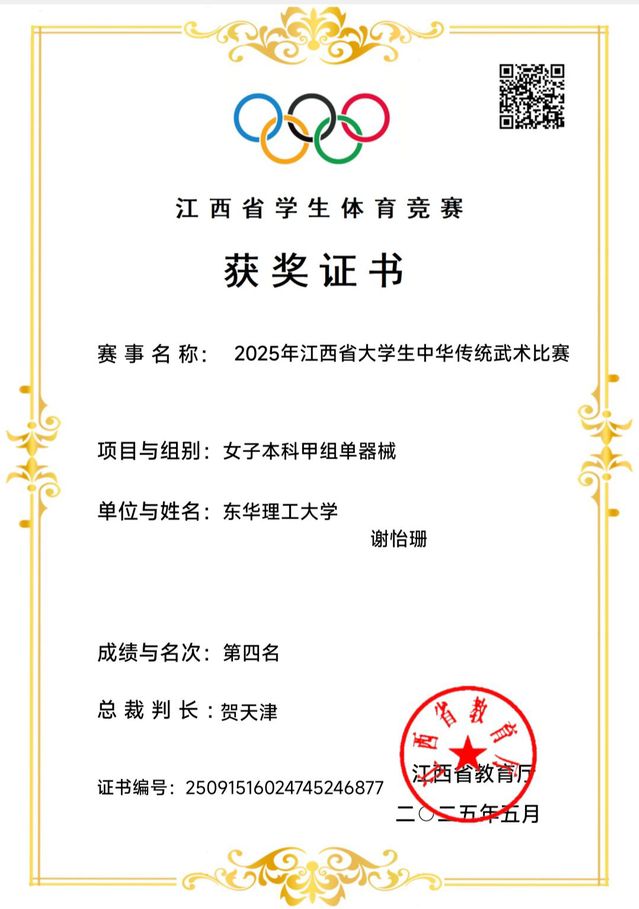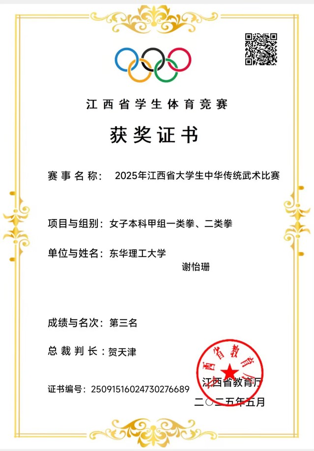近日,2025 年江西省大学生中华传统武术比赛结果公布,地球与行星科学乐竞官网24 级地球化学专业学生谢怡珊凭借稳定发挥在女子本科甲组一类拳、二类拳项目中获得第三名,在女子本科甲组单器械项目中获得第四名。