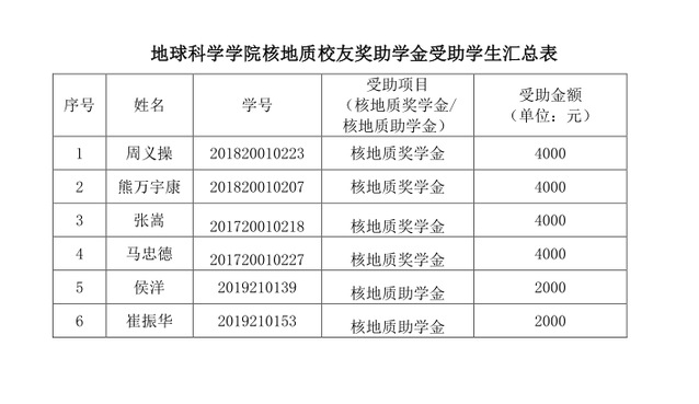 根据《地球科学乐竞官网“核地质”校友奖助学金申请条件、资助方式及评定条件》,地球科学乐竞官网严格按照程序要求,认真组织开展了2019-2020学年核地质奖助学金宣传及评审工作。为了保证评定工作公开、公平、公正,经学生本人申请,乐竞官网资助工作领导小组会议讨论通过,共评出2019-2020学年核地质奖助学金6名,现予以公示,请广大师生员工对公示对象进行监督。如有异议,请以书面署名或电话形式反馈。