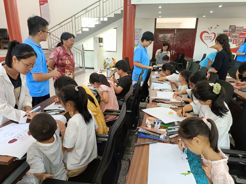 志愿者还教了小朋友们画画,志愿者与小朋友们讨论后引导小朋友们将自己的心理用色彩表现在纸上,画完之后相互交流了自己的创作想法并且展示了自己的作品。
